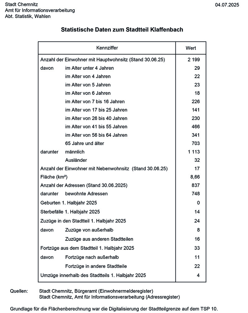 Besorgniserregend sind die aktuellen Informationen aus der Stadtverwaltung zur Entwicklung der Schülerzahlen. Für Klaffenbach ist ein deutlicher Rückgang ab dem Schuljahr 2029/30 prognostiziert. Sollte dieser Trend anhalten, könnte es zu einem Mitwirkungsentzug durch die Bildungsagentur kommen. Als Gegenmaßnahme wird eine Neuzuordnung der Schulbezirke erwogen. Darüber hinaus müsse frühzeitig aktiv für die Grundschule Klaffenbach geworben werden. Die ersten Planungen für die Schulstandortentwicklung sollen bereits im kommenden Jahr anlaufen.