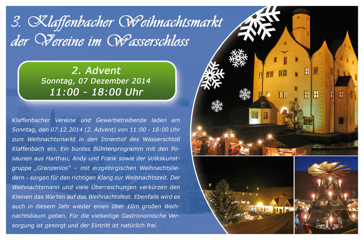 Knapp 8 Tage nach dem Pyramideanschieben findet zum dritten mal nun bereits der "Weihnachtsmarkt der Vereine" im Wasserschloß Klaffenbach statt. Auch dieses Jahr laden die Klaffenbacher Vereine und Gewerbetreibende Sie, liebe Besucher, wieder recht herzlich dazu ein, gemeinsam einen wundervollen 2. Advent im Innenhof des Wasserschloßes zu verbringen. Am Sonntag, den 07.12.2014 findet von 11:00 - 18:00 Uhr ein buntes Bühnenprogramm mit den Posaunen aus Harthau, Andy und Frank sowie der Volkskunstgruppe "Grenzenlos" - mit erzgebirgischen Weihnachtsliedern - statt. Der Weihnachtsmann und viele Überraschungen verkürzen den Kleinen das warten auf das Weihnachtsfest. Ebenfalls wird es auch in diesem Jahr wieder einen über 10m großen Weihnachtsbaum geben. Für die vielseitige gastronomische Versorgung ist gesorgt und der Eintritt ist natürlich frei. Über zahlreiche Besucher würden sich die Klaffenbacher sehr freuen.