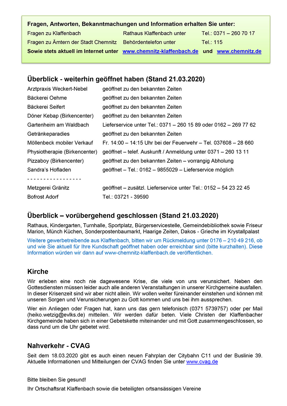 Weitere gewerbetreibende aus Klaffenbach, bitten wir um Rückmeldung unter 0176 - 210 49 216, ob und wie Sie aktuell für Ihre Kundschaft geöffnet haben oder erreichbar sind (bitte kurzhalten).