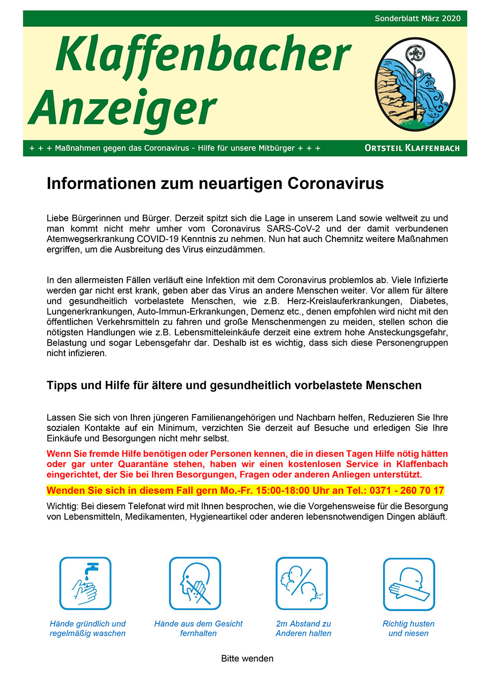 Aus diesem Anlass bleibt das Rathaus Klaffenbach bis auf Weiteres geschlossen. Dies betrifft die Sprechstunde des Ovst, die Ortschaftsratsitzungen, das Sekretariat, die Sprechstunde des Bürgerpolizisten, die Sprechzeiten der Mobilen Bürgerservicestelle sowie die Gemeindebibliothek. Wir werden Sie informieren, sobald der Betrieb wieder aufgenommen werden kann.