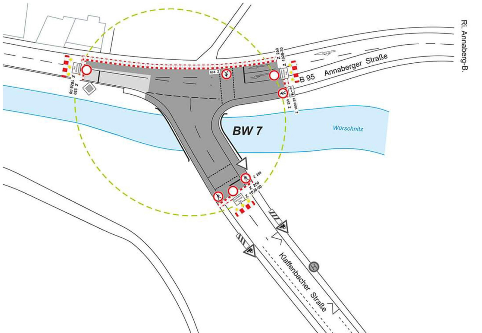 Aufgrund des Brückenneubaus über die Würschnitz in Harthau kommt es bis zum 18. November erneut zur Vollsperrung im Bereich B95 Abzweig Klaffenbacher Straße. Die Umleitung für den PKW Verkehr erfolgt über Klaffenbach - Chemnitzer Straße - Wolgograder Allee - Südring. Für LKW gilt eine Umleitung bereits ab Thum über Herold, die B174 und den Südring.