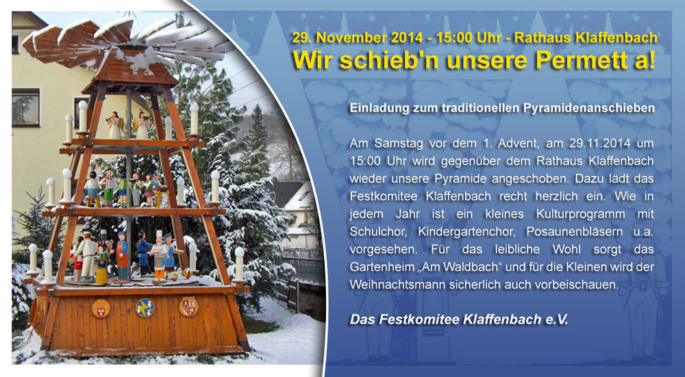 Am Samstag vor dem 1. Advent, am 29.11.2014 um 15:00 Uhr wird gegenüber dem Rathaus Klaffenbach wieder unsere Pyramide angeschoben. Dazu lädt diesmal das Festkomitee Klaffenbach recht herzlich ein. Wie in jedem Jahr ist ein kleines Kulturprogramm mit Schulchor, Kindergartenchor, Posaunenbläsern u.a. vorgesehen. Für das leibliche Wohl sorgt das Gartenheim „Am Waldbach“ und für die Kleinen wird der Weihnachtsmann sicherlich auch vorbeischauen.