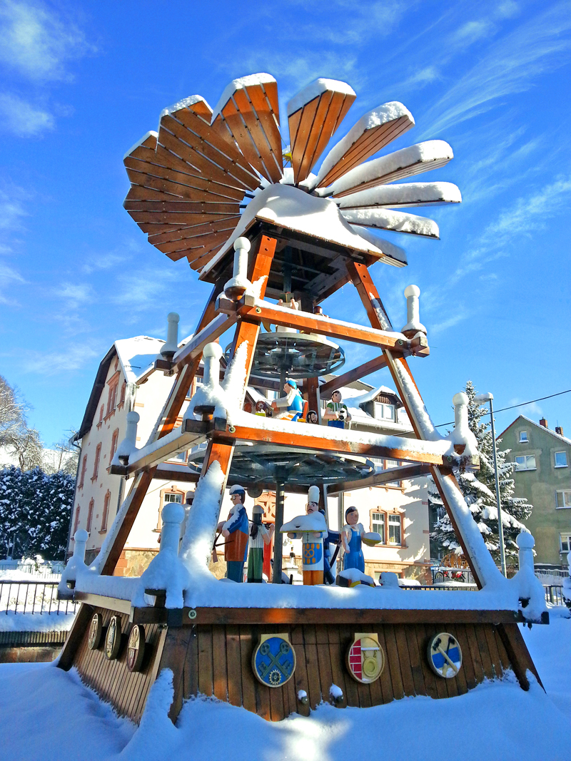 Uns're Permett - das Wahrzeichen unseres ehemaligen Erzgebirgsvereins. Noch knapp eine Woche darf sie sich im Schnee drehen und das Ortsbild von Klaffenbach neben dem Rathaus schmücken, dann geht's für 10 Monate in die wohlverdiente Adventspause. Pünktlich zum ersten Advent diesen Jahres oder besser am Samstag davor, wird sie dann wieder erneut angeschoben und läutet die neue Adventszeit ein.