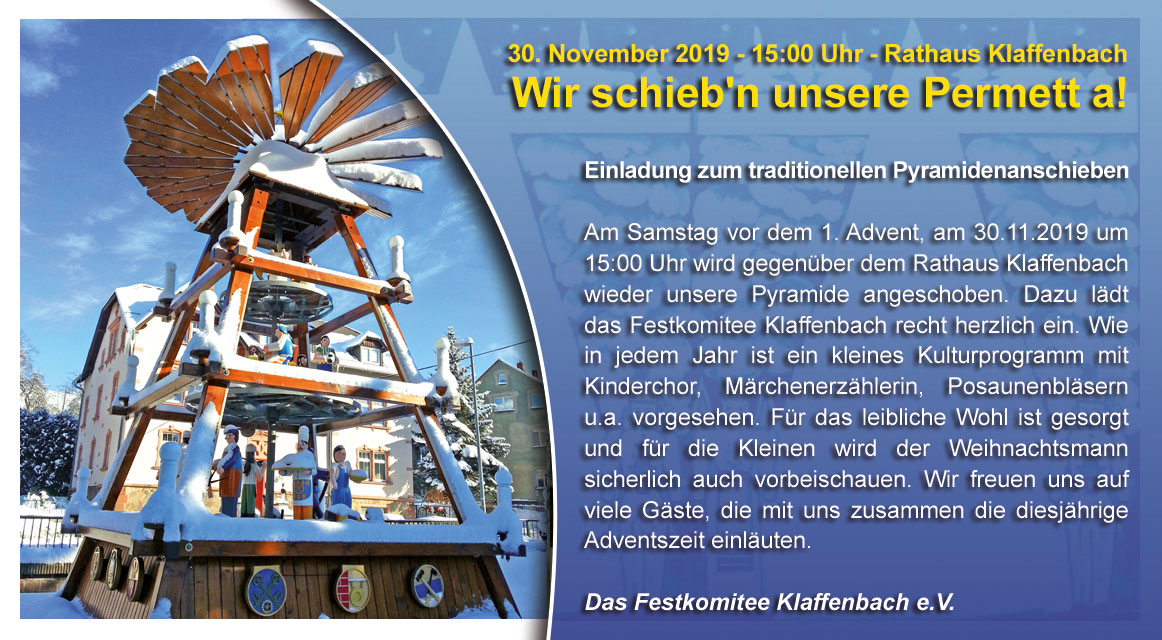 Am Samstag vor dem 1. Advent, am 30.11.2019 um 15:00 Uhr wird gegenüber dem Rathaus Klaffenbach wieder unsere Pyramide angeschoben. Dazu lädt das Festkomitee Klaffenbach recht herzlich ein. Wie in jedem Jahr ist ein kleines Kulturprogramm mit Kinderchor, Märchenerzählerin, Posaunenbläsern u.a. vorgesehen. Für das leibliche Wohl ist gesorgt und für die Kleinen wird der Weihnachtsmann sicherlich auch vorbeischauen.