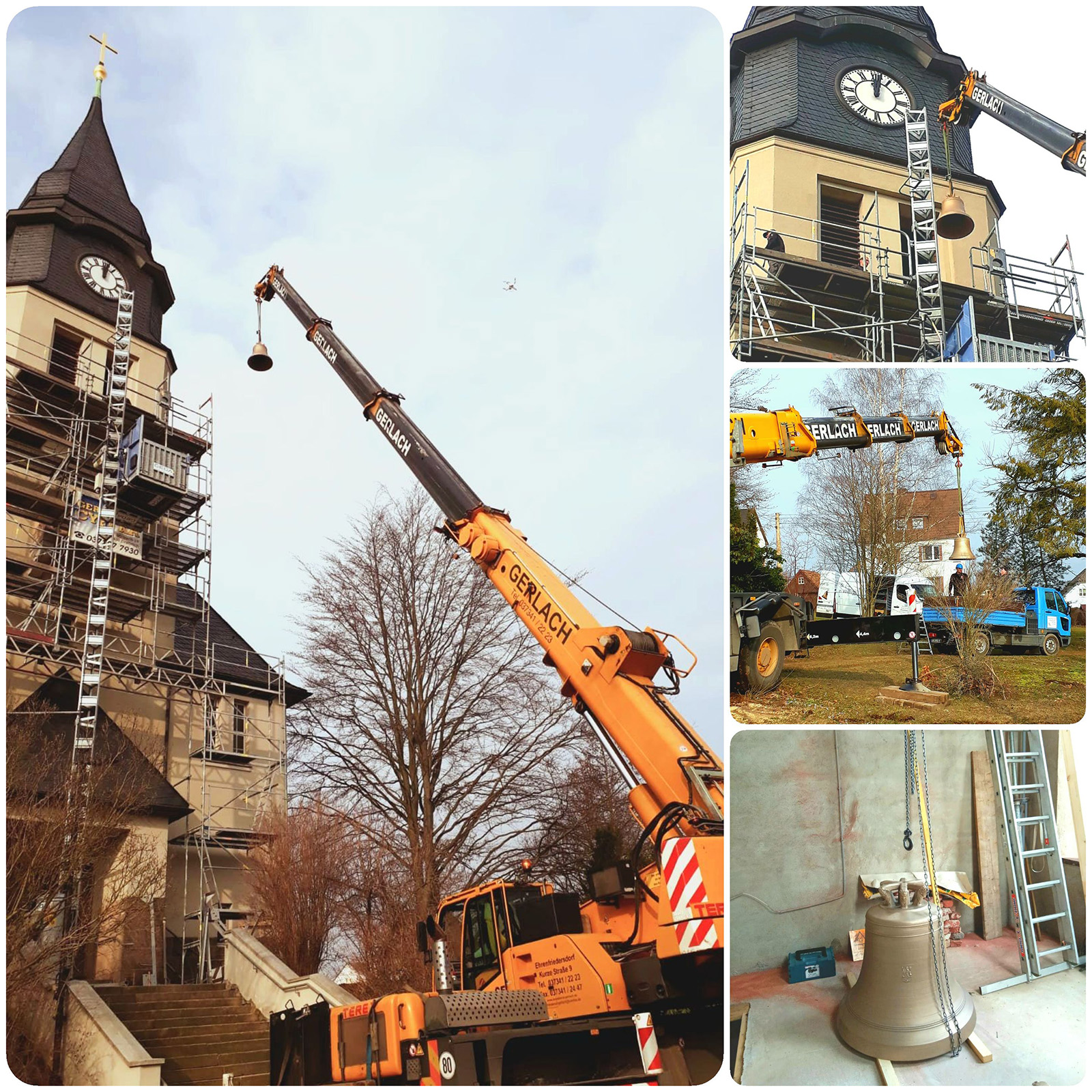 Am Donnerstag, den 04. März, war es endlich soweit. Die neuen Bronzeglocken wurden in den Kirchturm gehoben. Schon in den Wochen zuvor wurde der Kirchturm dafür aufwendig saniert und vorbereitet. Also nächstes wird noch der neue Glockenstuhl aus Eichenholz errichtet, an dem die Glocken dann hängen sollen sowie das restaurierte Uhrwerk und die gesamte Glockenmechanik eingebaut. Bis Ende des Monats soll alles fertig sein, denn am 28. März sollen die neuen Glocken, wie geplant, das erste Mal läuten.